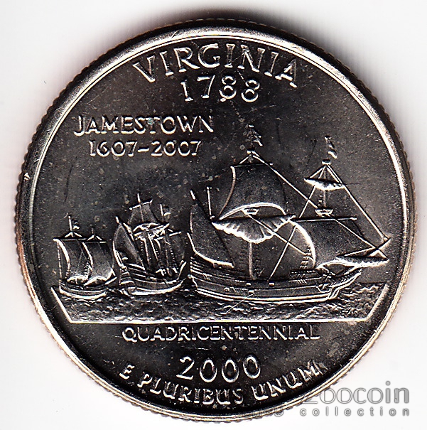 Вирджиния - названа в честь королевы-девственницы (англ. Virgin-Queen) Елизаветы I в 1594 г. Старейшая британская колония в Америке. В 1607 г. флотилия из трех судов доставила из Британии переселенцев, которые основали первое постоянное английское поселение, названное в честь короля Якова I (James I) Джеймстаун. В 2007 г. этому городу исполнится 400 лет, и жители штата, видимо, так гордятся этим, что за 6 лет до юбилея уже отчеканили на монете эту дату. Обо всем этом и рассказывают изображенные на монете корабли и надписи "Джеймстуан, 1607-2007, Четырехстолетие"