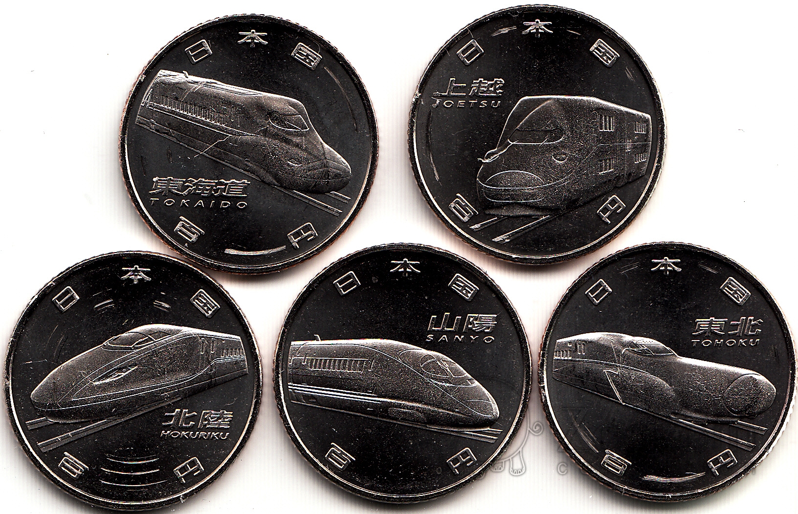 Япония набор 5 монет 2015 50 лет Высокоскоростной Железной Дороге Синкансен
