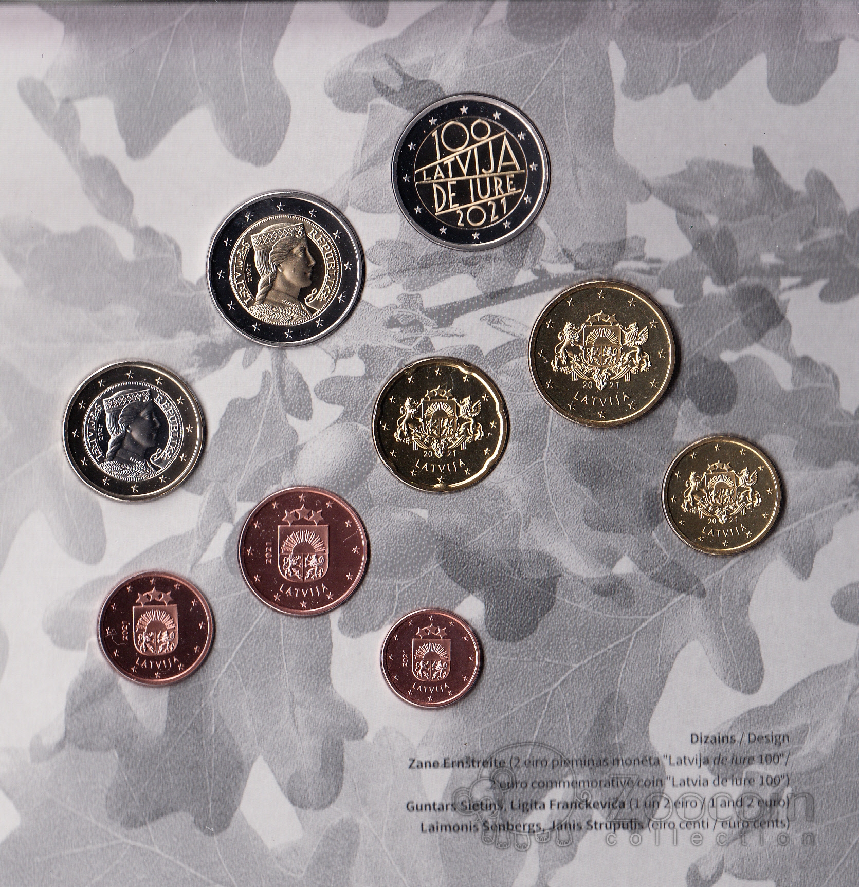 Латвия годовой набор 9 монет евро 2021 С 2 евро 2021 100 лет Признания Латвии Де-юре (блистер)
