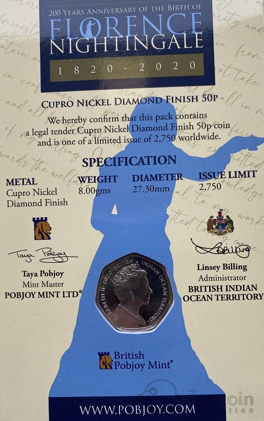 Брит. территория в Индийском океане 50 пенсов 2020 200 лет со Дня рождения Флоренс Найтингейл (блистер)