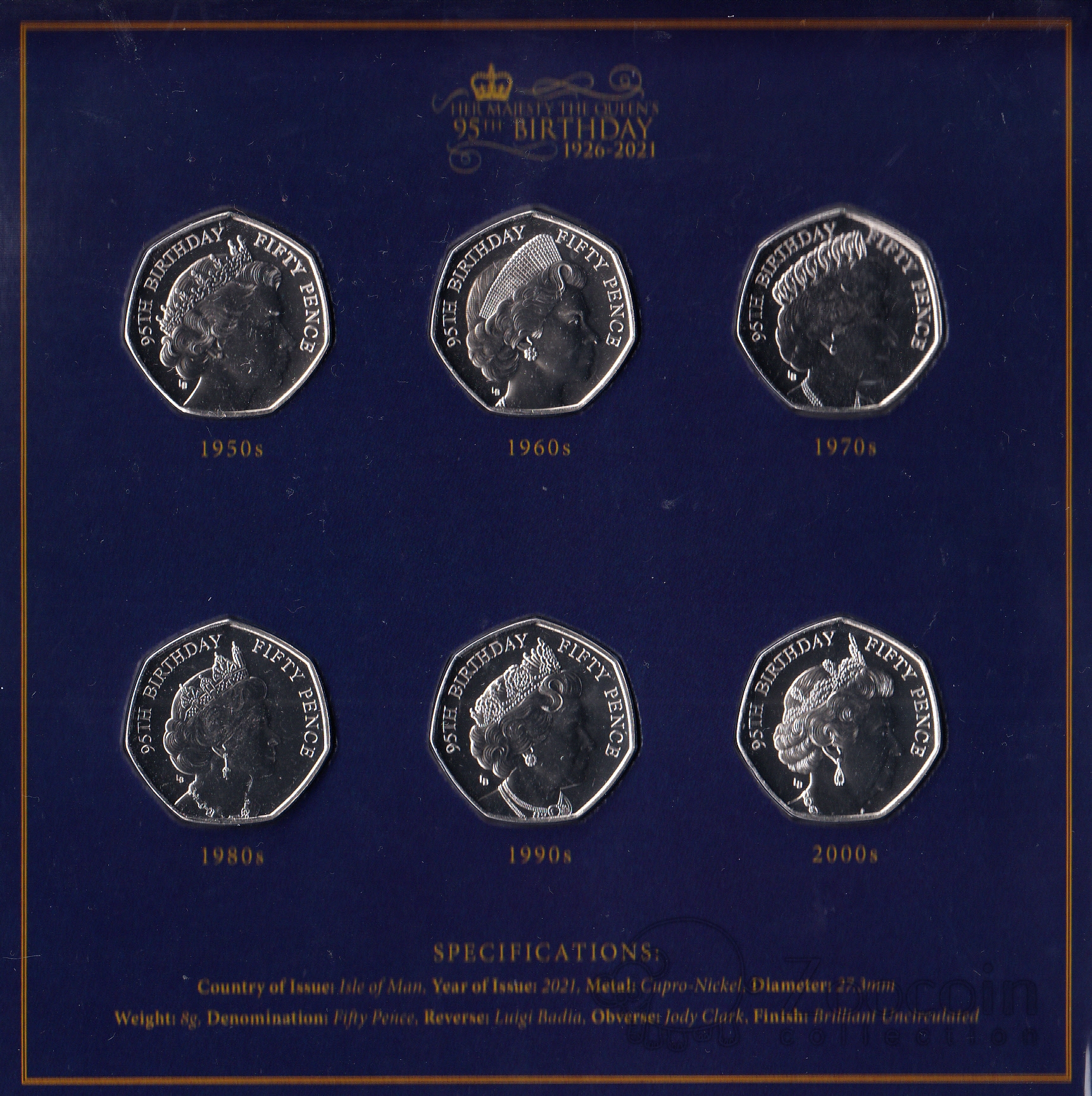 Остров Мэн набор 6 монет 50 пенсов 2021 95 лет со Дня рождения королевы Елизаветы 2 - портреты (блистер)
