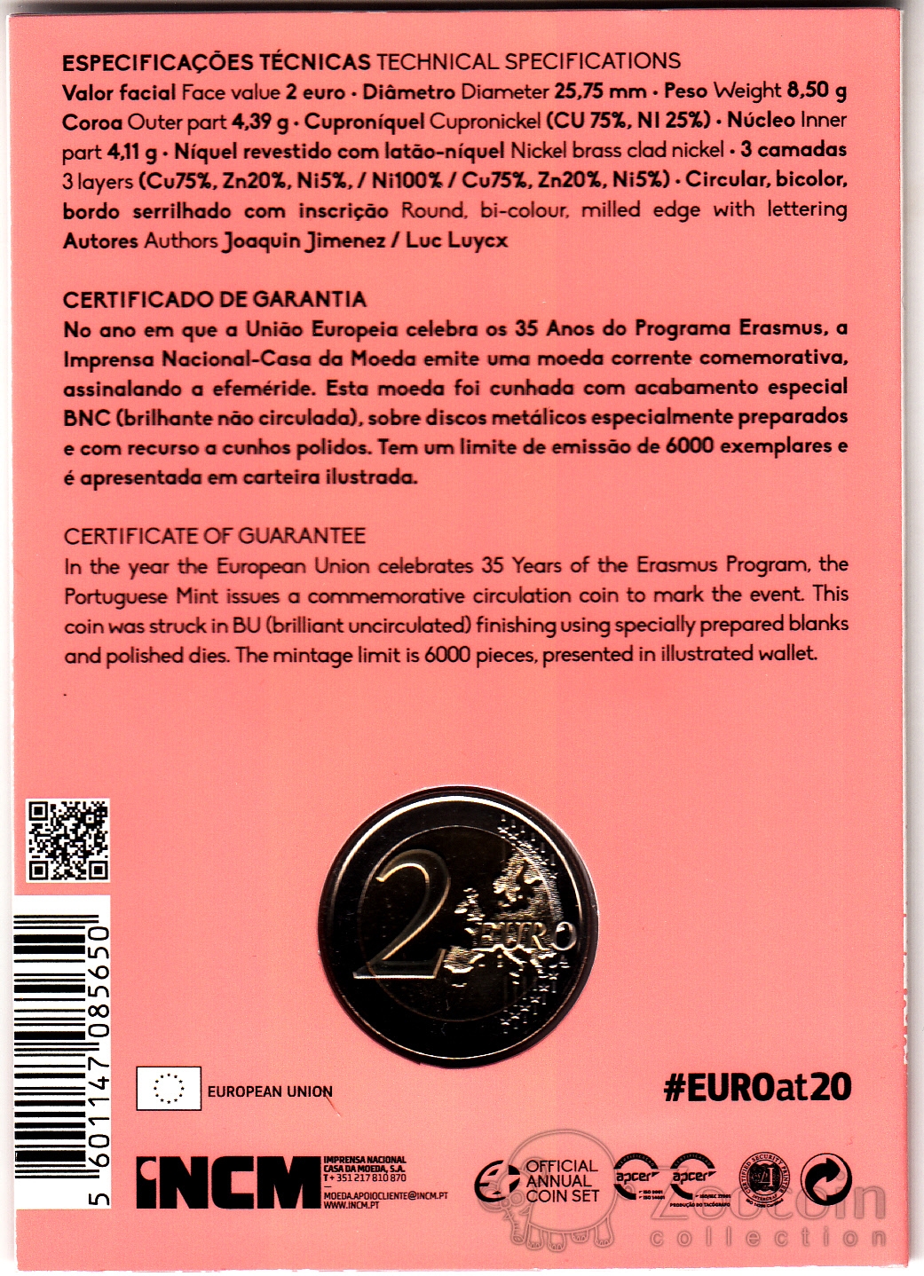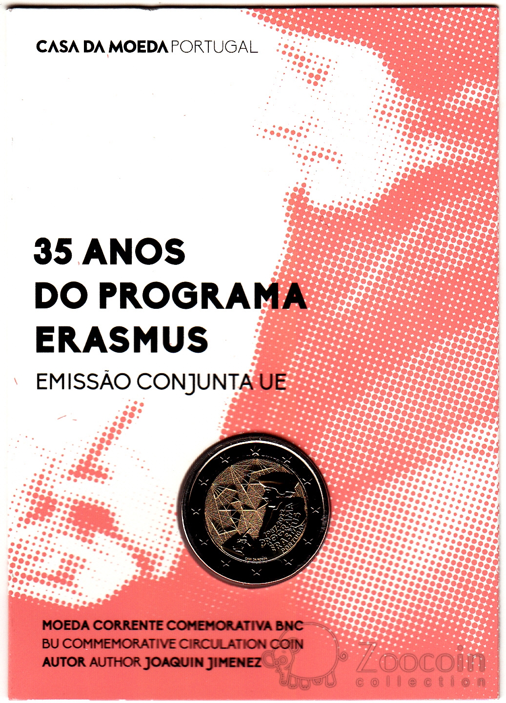 Португалия 2 евро 2022 35 лет программе Erasmus (карта, BU)