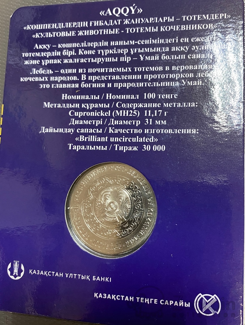 Казахстан 100 тенге 2021 Культовые животные тотемы кочевников - Лебедь (Aqqy) (блистер)