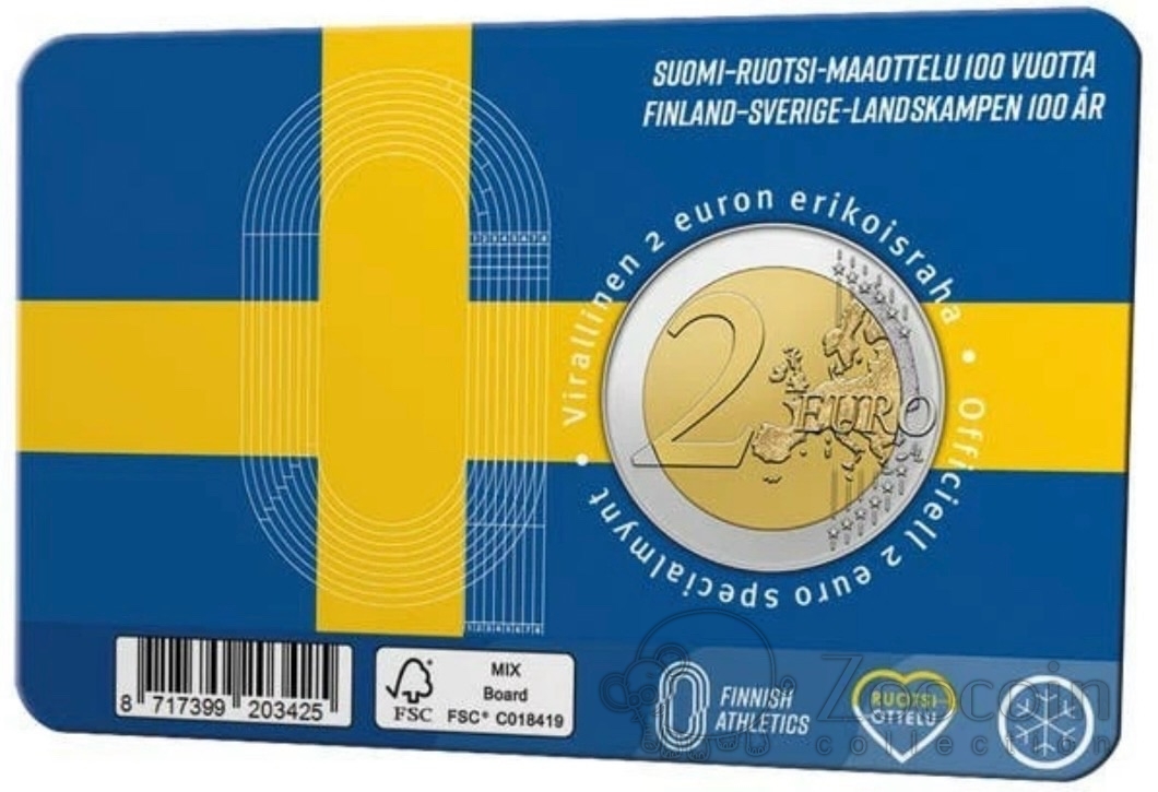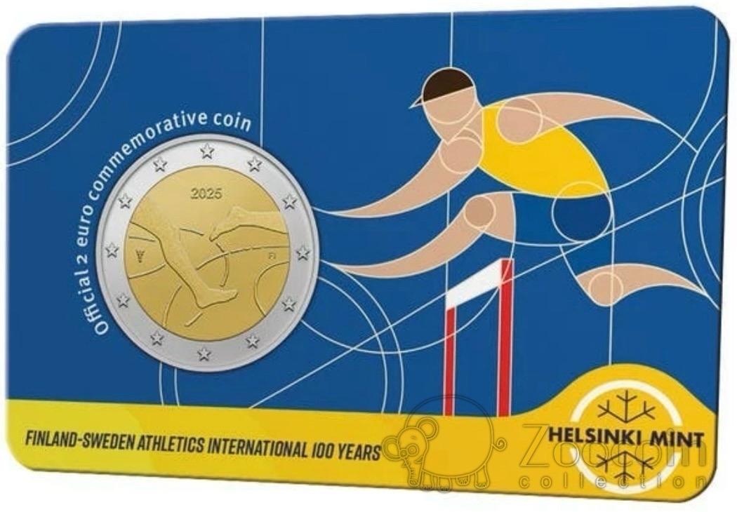 Финляндия 2 евро 2025 100 лет Финско-шведским легкоатлетическим играм (карта синяя)
