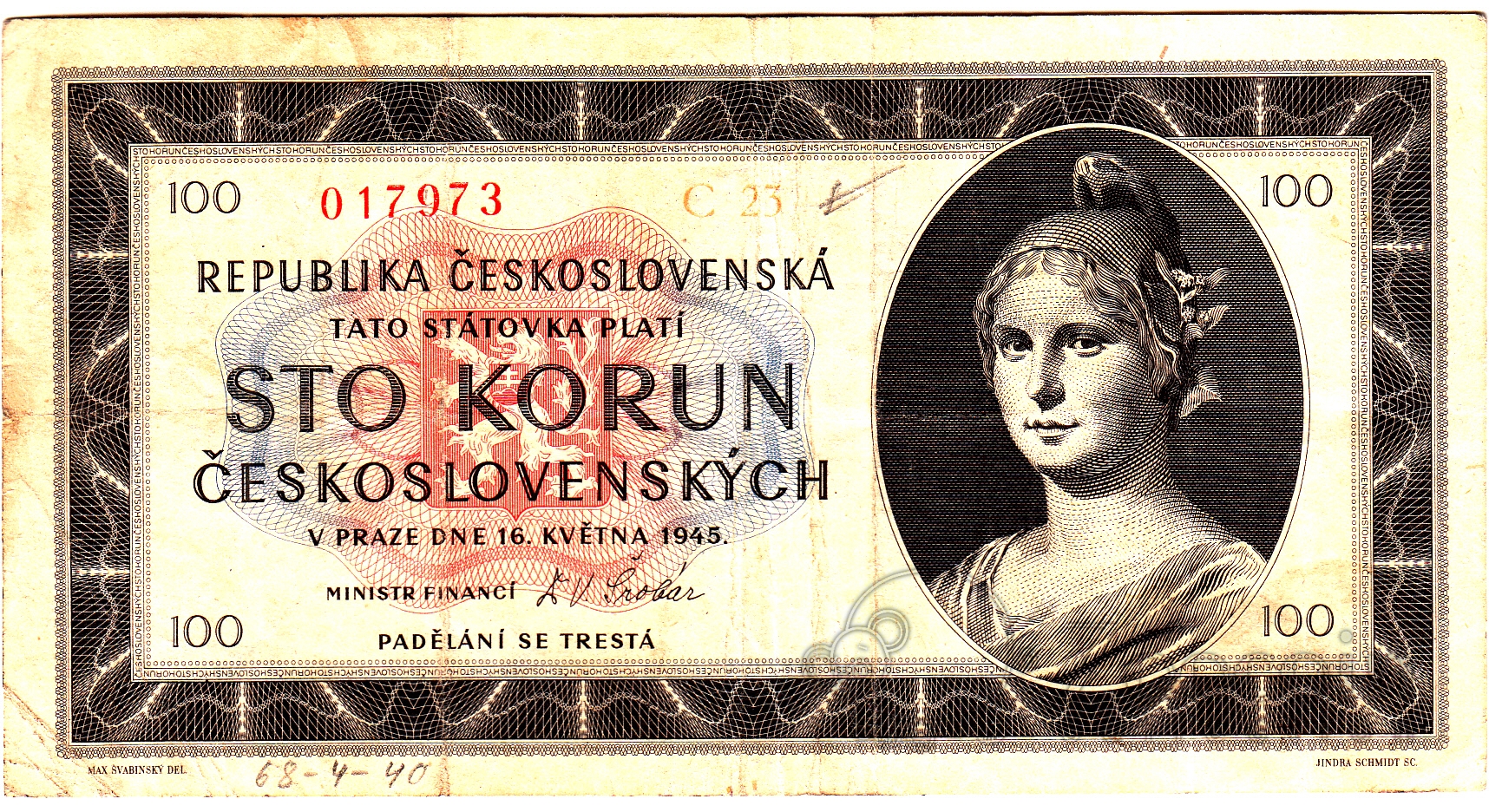 Чехословакия 100 крон 1945 (тип 2)