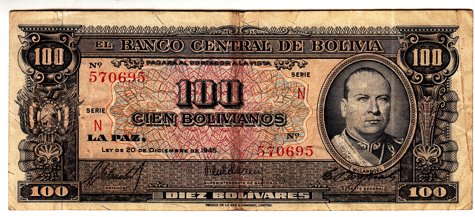 Боливия 100 боливиано 1945 тип 1