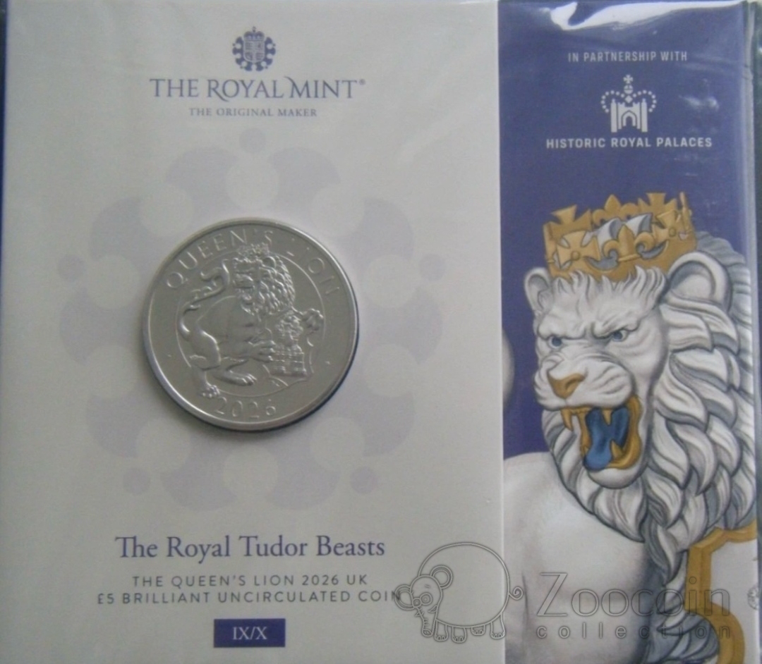 Великобритания 5 фунтов 2026 Звери Тюдоров - Королевский лев / Лев королевы (блистер)